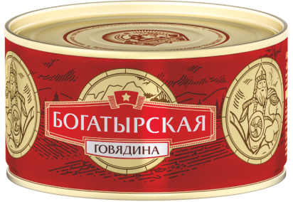 Тушёная говядина «Богатырская» имеет вид колбасного фарша, что позволяет употреблять её самыми разными способами, удовлетворяя вкус даже капризных богатырей, предпочитающих для сытности, всё есть с хлебом. Ещё совсем недавно русские богатыри, а также их жёны, дети, тёщи, дядья, свояки и свёкры регулярно совершали длительные переходы в направлении столичных городов единственных мест промысла колбасы. Таща добычу на своих богатырских плечах, им приходилось быть не только сильными и выносливыми, но и быстрыми, юркими и внимательными колбасу могли отобрать, украсть, выманить обманом или угрозой. Испытания не только не сломили русичей, но сделали их ещё крепче и целеустремлённее. Именно таким, настоящим богатырям земли русской, мы посвящаем эту говядину.